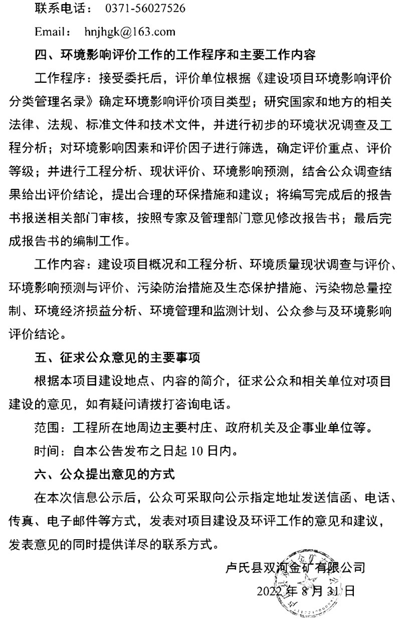 盧氏縣雙河金礦有限公司礦產(chǎn)資源開(kāi)采項目環(huán)境影響評價(jià)公眾參與***次公示